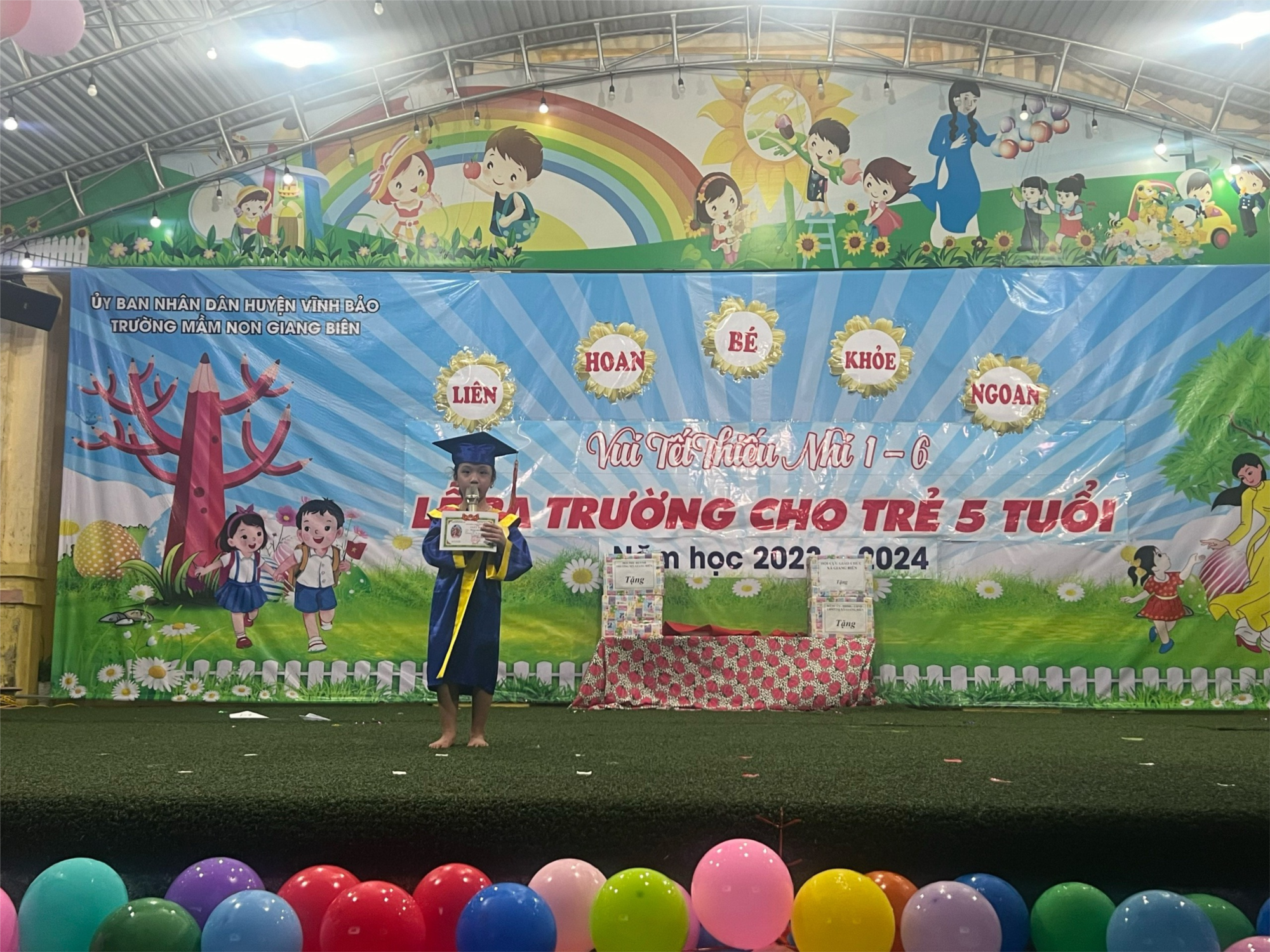 Trong thời gian học dưới mái trường Mầm non Giang Biên, chúng con đã được bàn tay thương yêu của các cô nâng niu, chăm sóc, lo từng bữa ăn, giấc ngủ, dạy cho chúng con biết bao điều . Nay chúng con phải chia tay các cô , tạm biệt mái trường thân mầm non thân yêu chúng con rất nhớ các cô, Con xin kính chúc các cô luôn mạnh khỏe, chúc các em ở lại chăm ngoan học giỏi. Chúng con xin hứa khi bước chân vào ngôi trường Tiểu học sẽ là những con ngoan trò giỏi để luôn xứng đáng với sự chăm sóc và dạy bảo của các cô. Con xin chân thành cảm ơn
