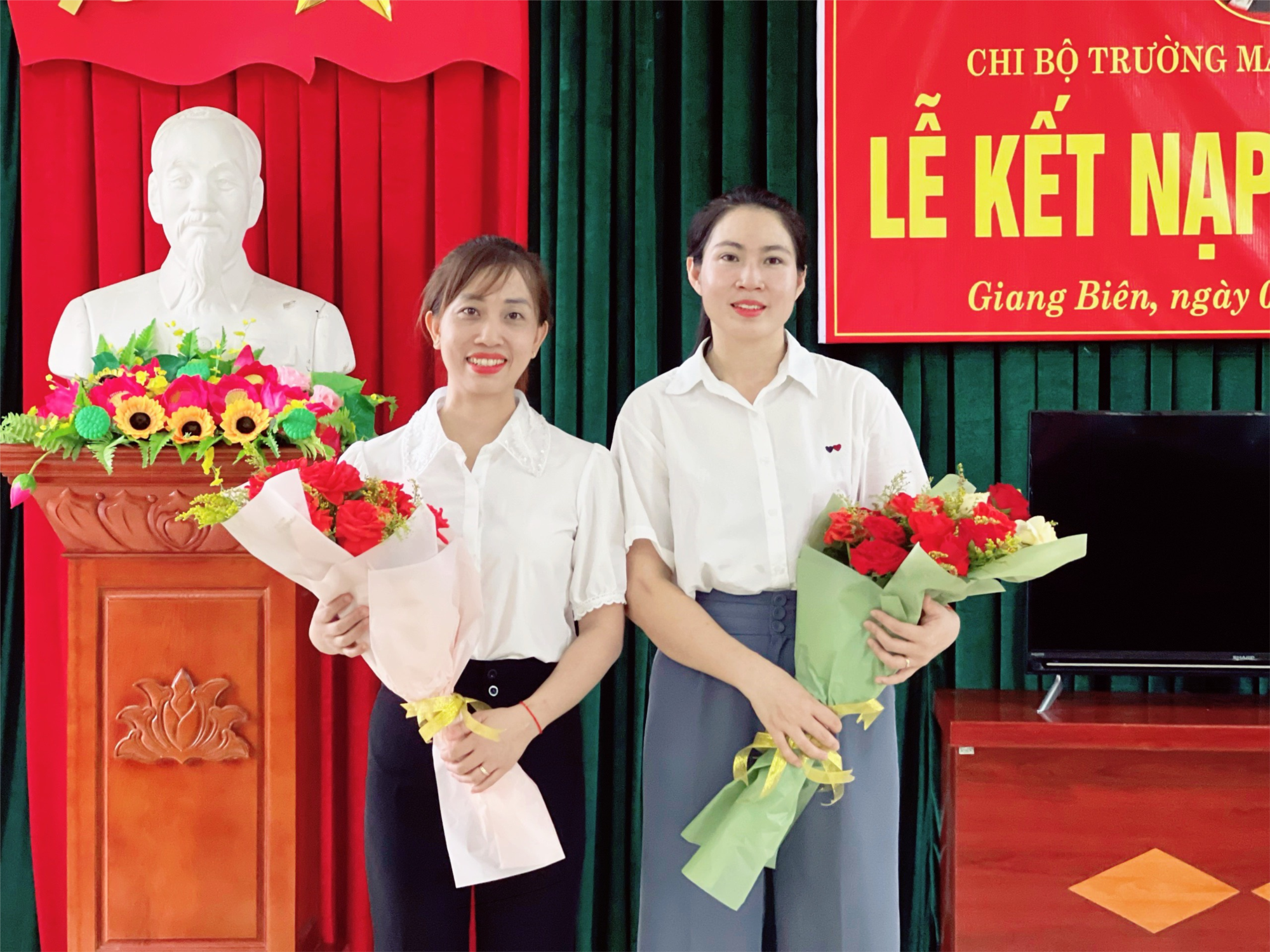 Thực hiện quyết định số 613/QĐ- HU ngày 17/06/2024 của Ban Thường vụ Huyện ủy về việc kết nạp đảng viên, được sự nhất trí của Thường trực Huyện ủy và Đảng ủy xã Giang Biên, chi bộ trường mầm non Giang Biên tiến hành tổ chức lễ kết nạp đảng viên cho 02 quần chúng ưu tú : Lã Thị Loan và Nguyễn Thị Tuyền