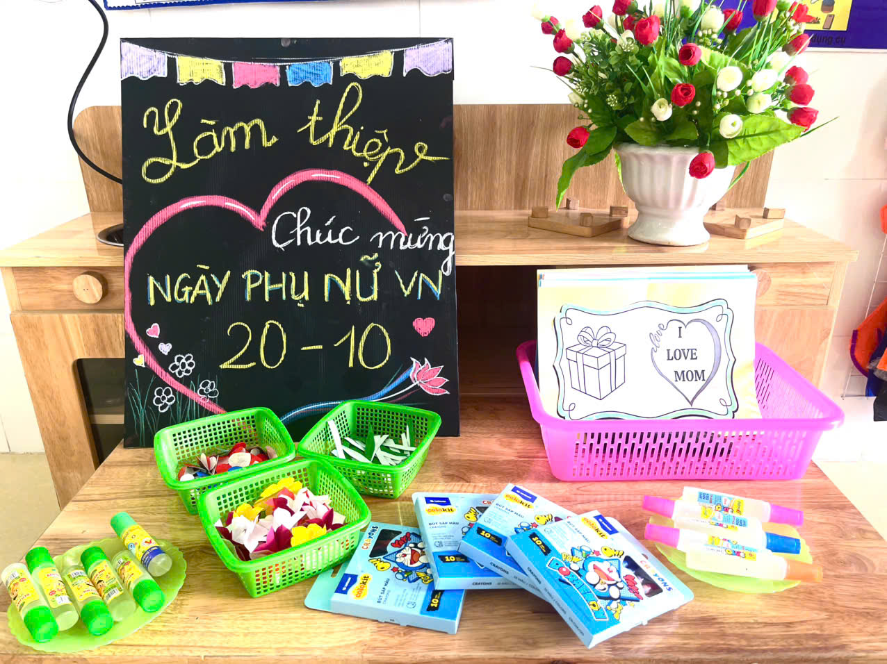 Ngay từ sáng sớm, lớp học rộn ràng tiếng cười nói, bàn tay nhỏ xinh của các bé thoăn thoắt cắt dán, tô màu những cánh hoa từ giấy màu rực rỡ sắc màu . Dưới sự hướng dẫn nhẹ nhàng của cô giáo, từng bông hoa, từng tấm thiệp nhỏ dần được hoàn thiện với biết bao tình cảm yêu thương.